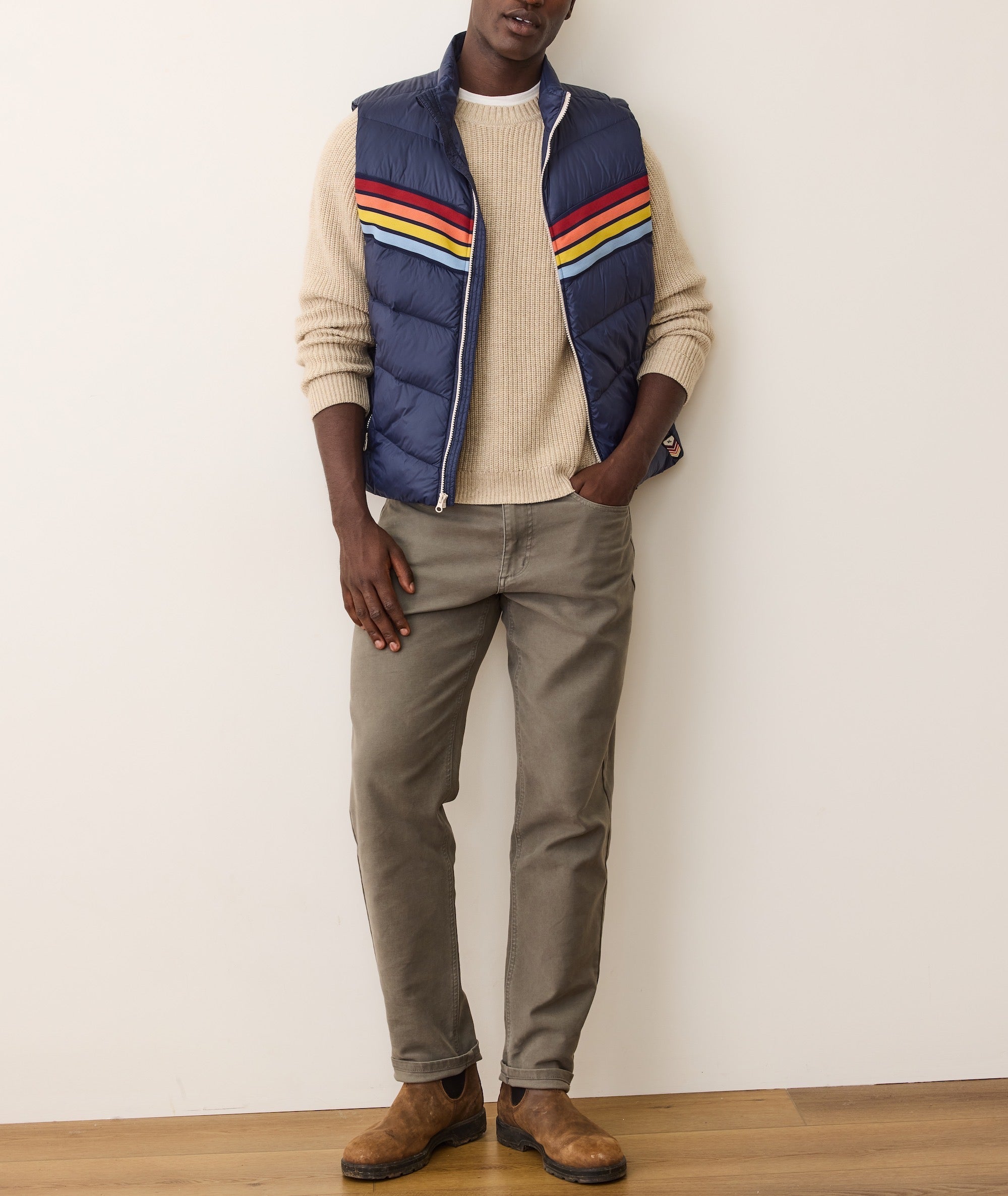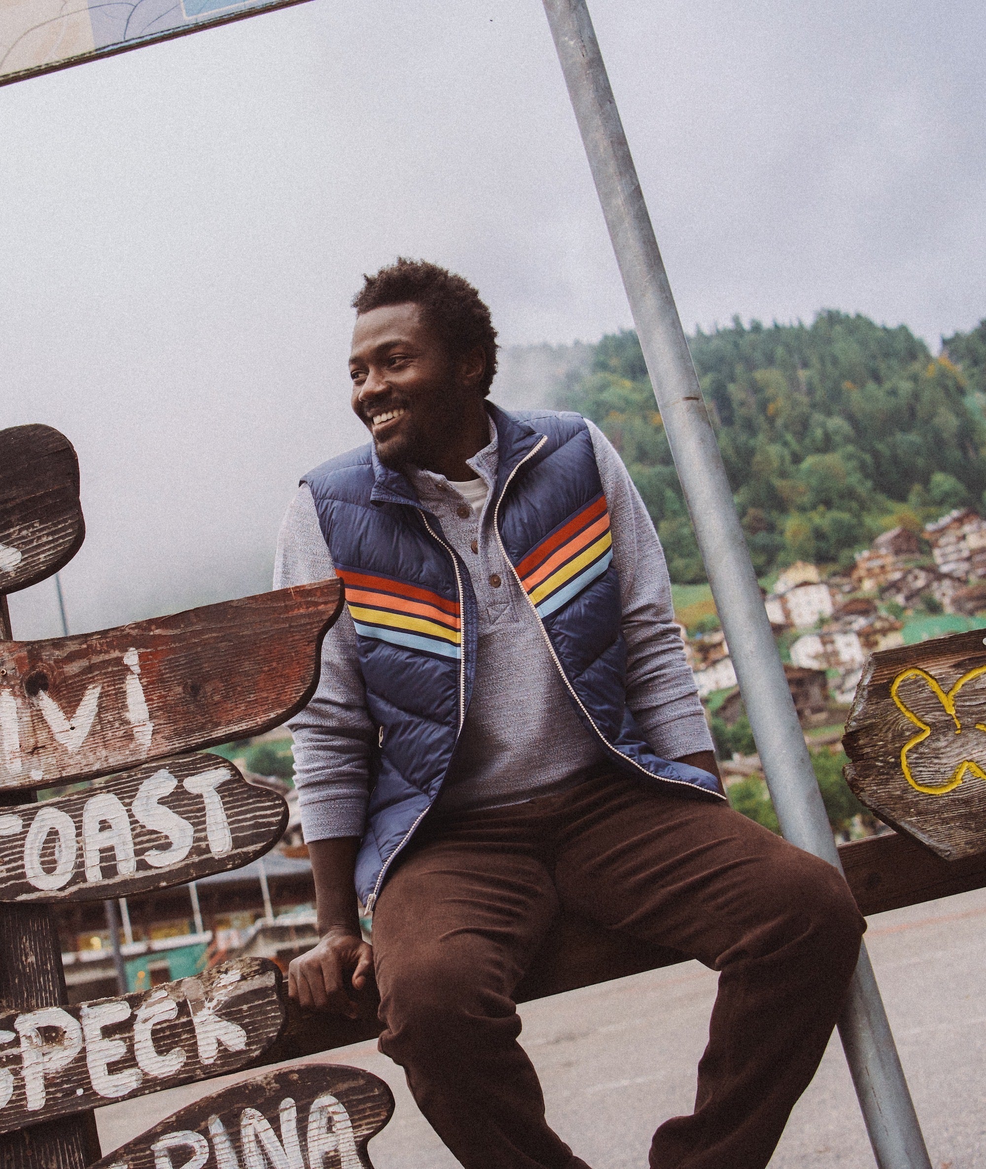 ust because you're doing après indoors, that doesn't mean you should miss out on the vintage style. So we made this 70s-inspired ski vest with a new, ultra stretchy sunset stripe across the chest and, as is traditional for vests, no arms. That means it's warm enough to run outside and turn on the hot tub, but not so warm you have to take off when you come back indoors. Just don't keep wearing it when you get in the hot tub, okay?
