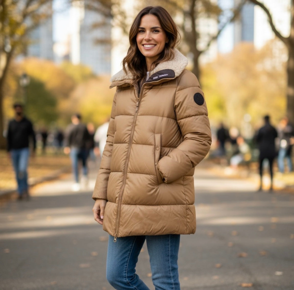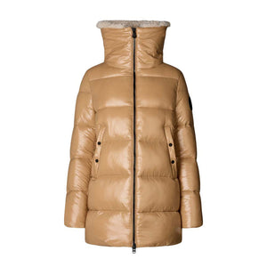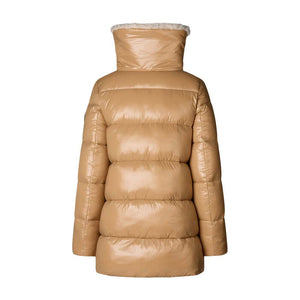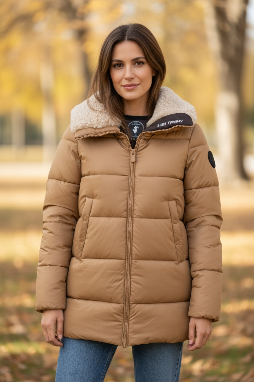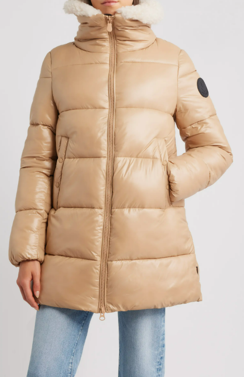 A cozy shawl collar lined in faux shearling zips up to become a windblocking stand collar on this A-line puffer jacket made from recycled nylon.