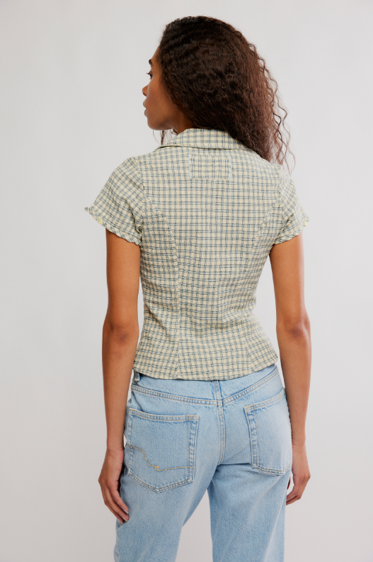 Add that vintage vibe to your look with this button-front top from We The Free, featuring a fitted bodice, ruched underbust, and collared V-neckline for an elevated finish.