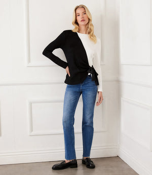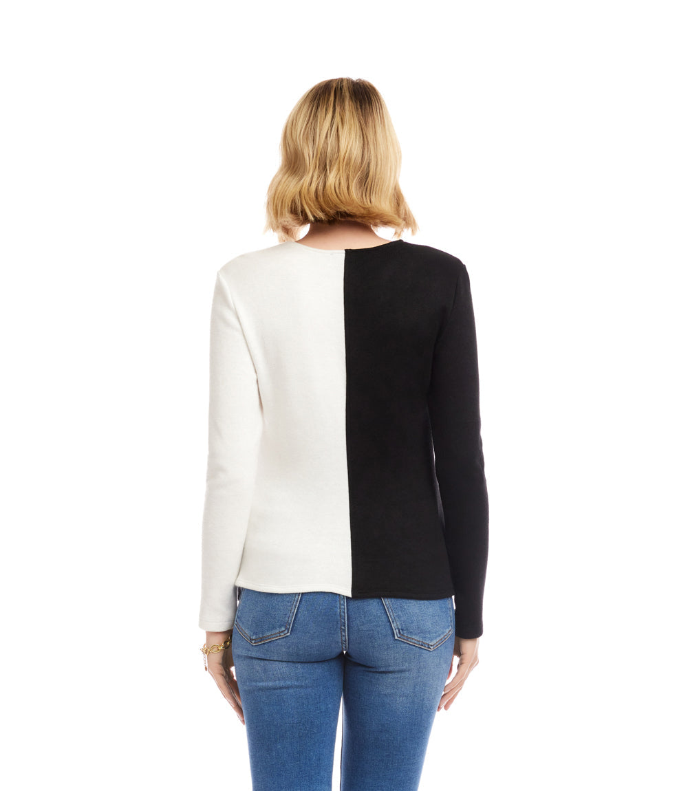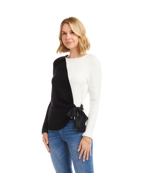 Modern and feminine, this top features a striking black-and-white colorblock design with a chic faux satin bow detail at the side for added elegance. Crafted from double brushed knit fabric, it offers a super-soft feel with a smooth drape. The crew neckline keeps the look clean and classic, while the set-in long sleeves create a polished silhouette.