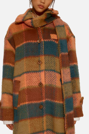 Bring a cozy edge to your outerwear collection with this longline coat, featured in a soft wool fabrication and single-breasted design, finished with a bold print and an attached scarf for an added touch.