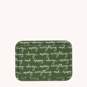 Our gathering trays are perfect to gather change, keys, glasses or as a simple addition to your decor. Strong enough to act as serving tray, light enough to be hung as art and charming enough to be used on tabletop. And how often do you get to add to your home decor with something made in the USA (and cute too!)? Green with white letters in a repeat pattern of "Merry Everything & Happy Always". High-impact fiberglass Dishwasher safe Stain and odor resistant. Made in the USA Size: 4 1/4" x 6"