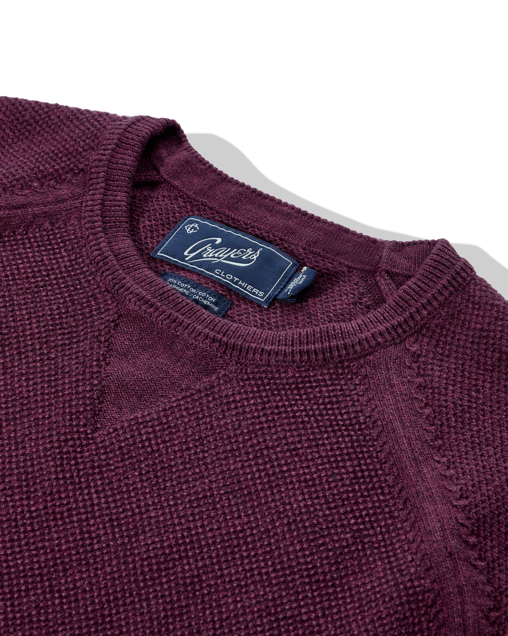Introducing the textured and very tactile Ernest sweater. A blend of cotton (for comfort), cashmere (for warmth), knit in tonal shades of heather yarns into a fine "tuck stitch" textured knit, giving the sweater beautiful tones and depth.