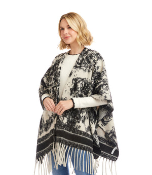 Brushed Jacquard Knit Fringe Poncho - Ecru w/ Black