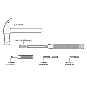- Includes two flat head and two cross head screwdrivers, nested in the handle of the hammer