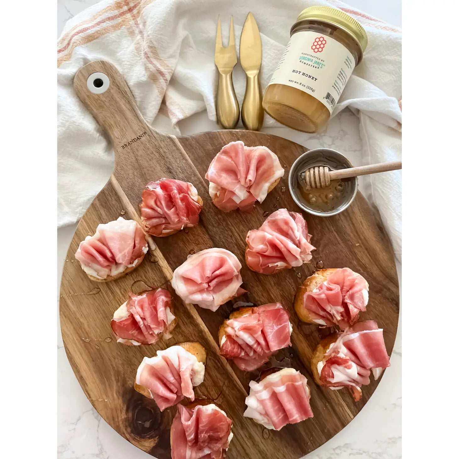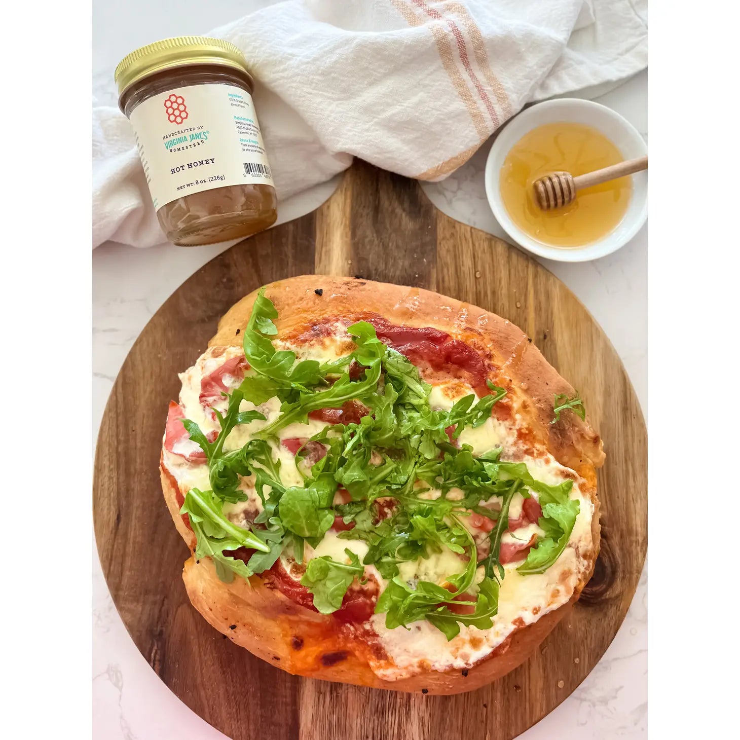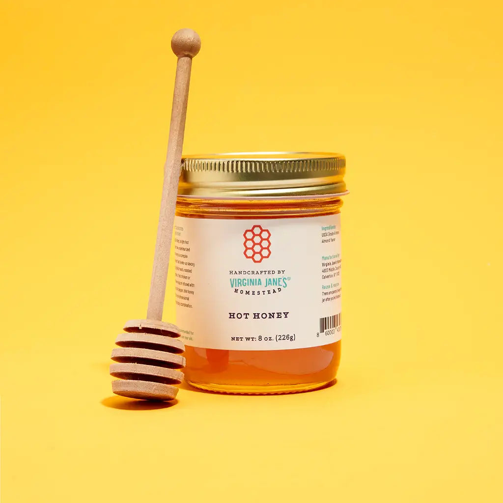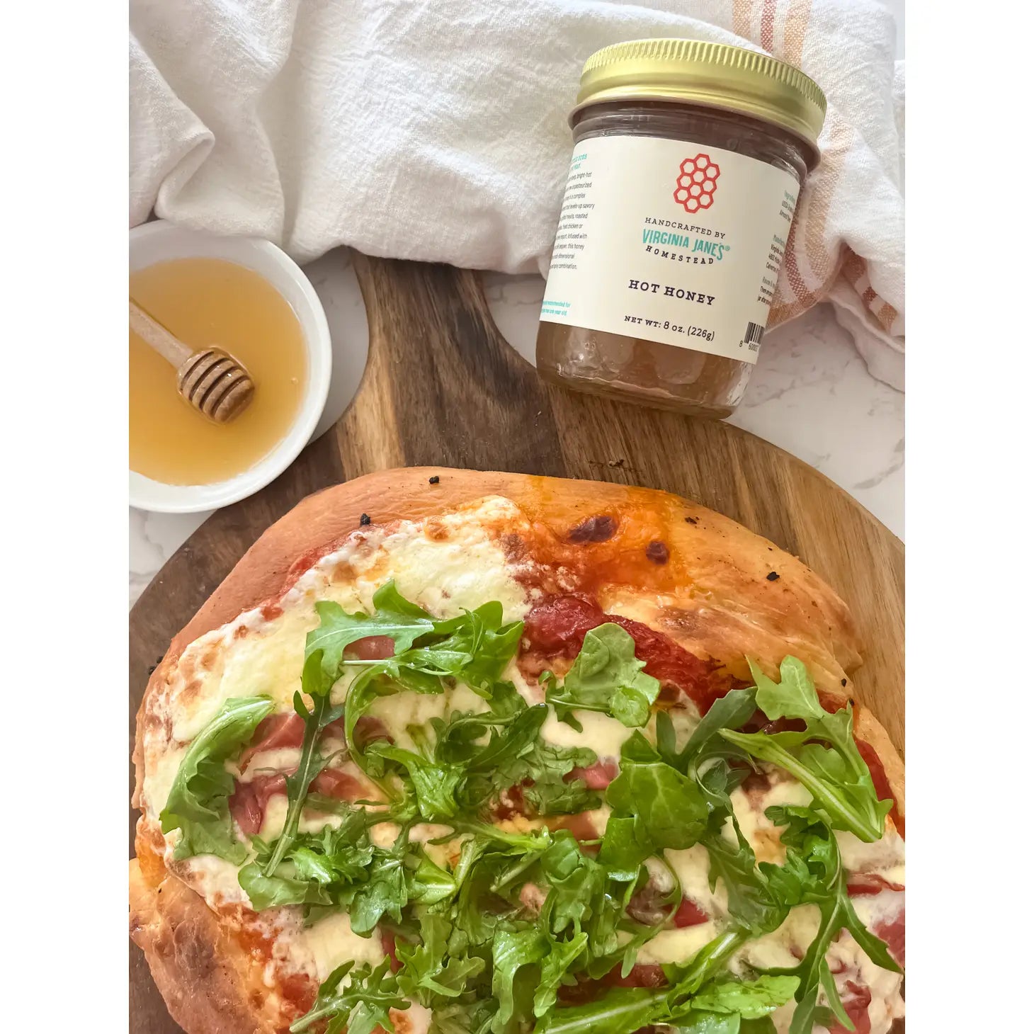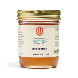 Virginia Jane's Hot Honey is a must-try for cheese lovers who crave a little kick in their condiments. Rich, velvety raw clover honey provides the perfect backdrop for the bold, spicy flavors of the chili oil, making it a perfect pairing for everything from mild mozzarella to sharp cheddar. This unique blend of raw clover honey with chili oil has the secret ingredient creates a tantalizing balance of sweet and heat that's perfect for pairing with your favorite cheeses, or add some sizzle to your favorite foods. This versatile condiment is easy to use - simply drizzle it over your favorite cheese or use it as a dipping sauce on chicken. Drizzle it over biscuits or glaze on grilled meat. It's excellent for adding a sweet and spicy touch to cheese-based dishes and recipes. Whether you're a cheese connoisseur or just looking to add some extra flavor to your cheese plate, our Hot Honey is the perfect addition. Try it today and experience the delicious taste sensation for yourself!