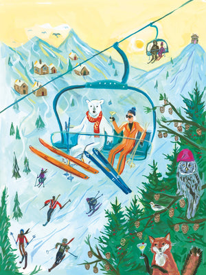 Escape to the snowy slopes with Last Chair Chill, a 1000 piece jigsaw puzzle illustrated by the imaginative Jenny Kroik. This playful and stylish winter scene captures a well-dressed skier effortlessly riding the lift up the mountain, cocktail in hand and perfectly poised—completely at ease next to her unlikely ski companion: a relaxed polar bear.