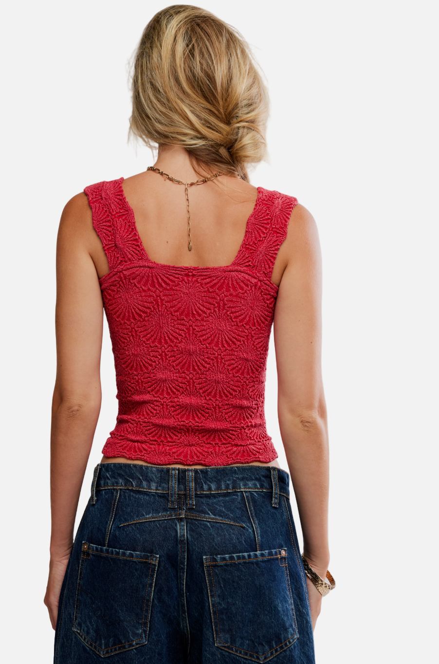 So sweet cami featured in a cropped, square-neck silhouette and jacquard floral design with statement lettuce-edge hemline.