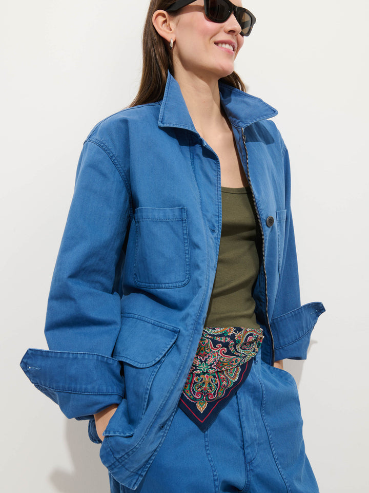 - Finished with a zip closure, bellow pocket, corozo buttons, wrist closures, a locker loop, and fully flat-felled seams throughout (no loose threads anywhere).