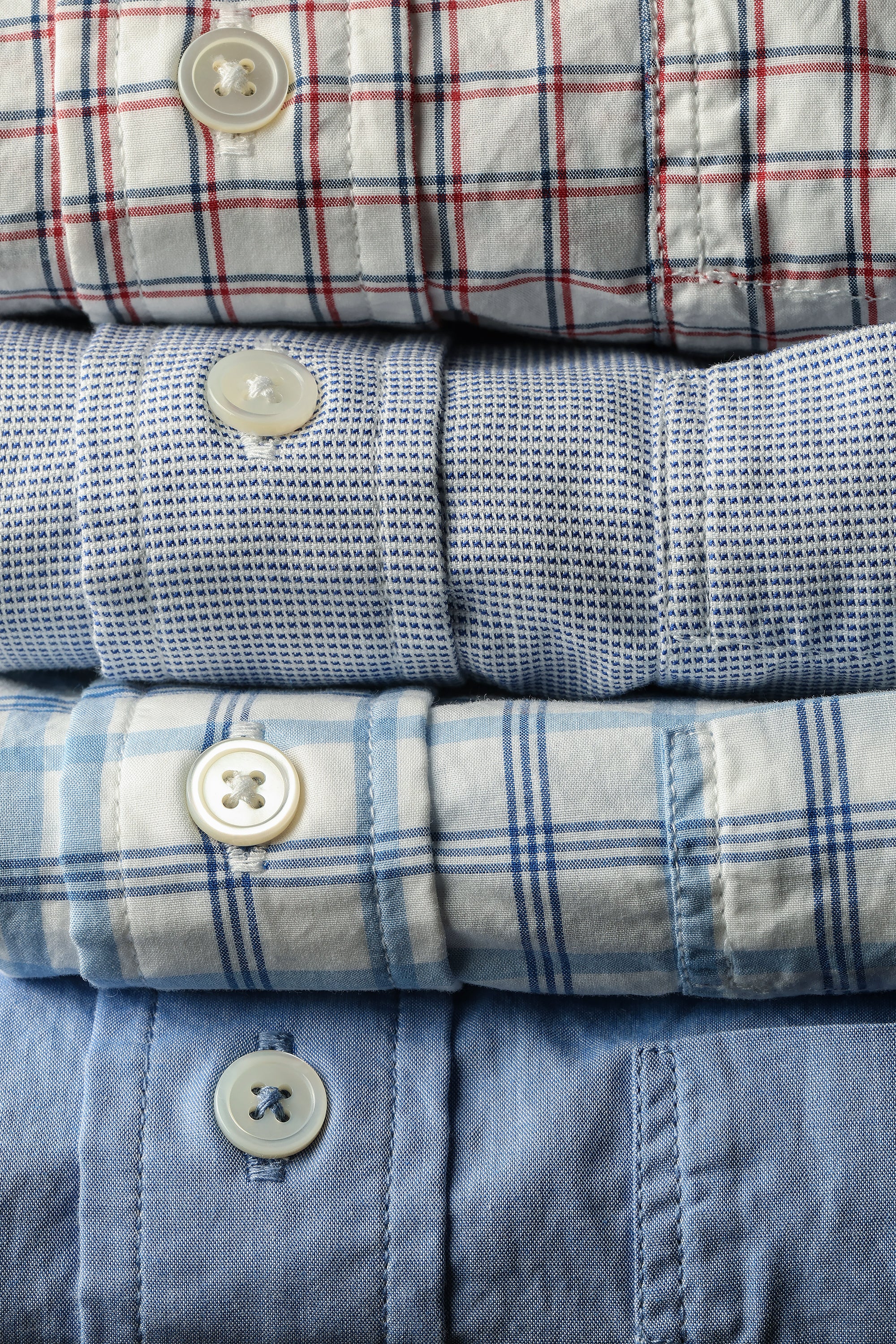 A year-round shirt quality, broadcloth should represent 70% of every man’s closet. When properly done it possesses a snap and refinement that is unmatched for cool handfeel. A classic grouping of small-scale graph checks and yarn-dyed solids that complement every variation of military, athletic, or classic based bottoms we make.
