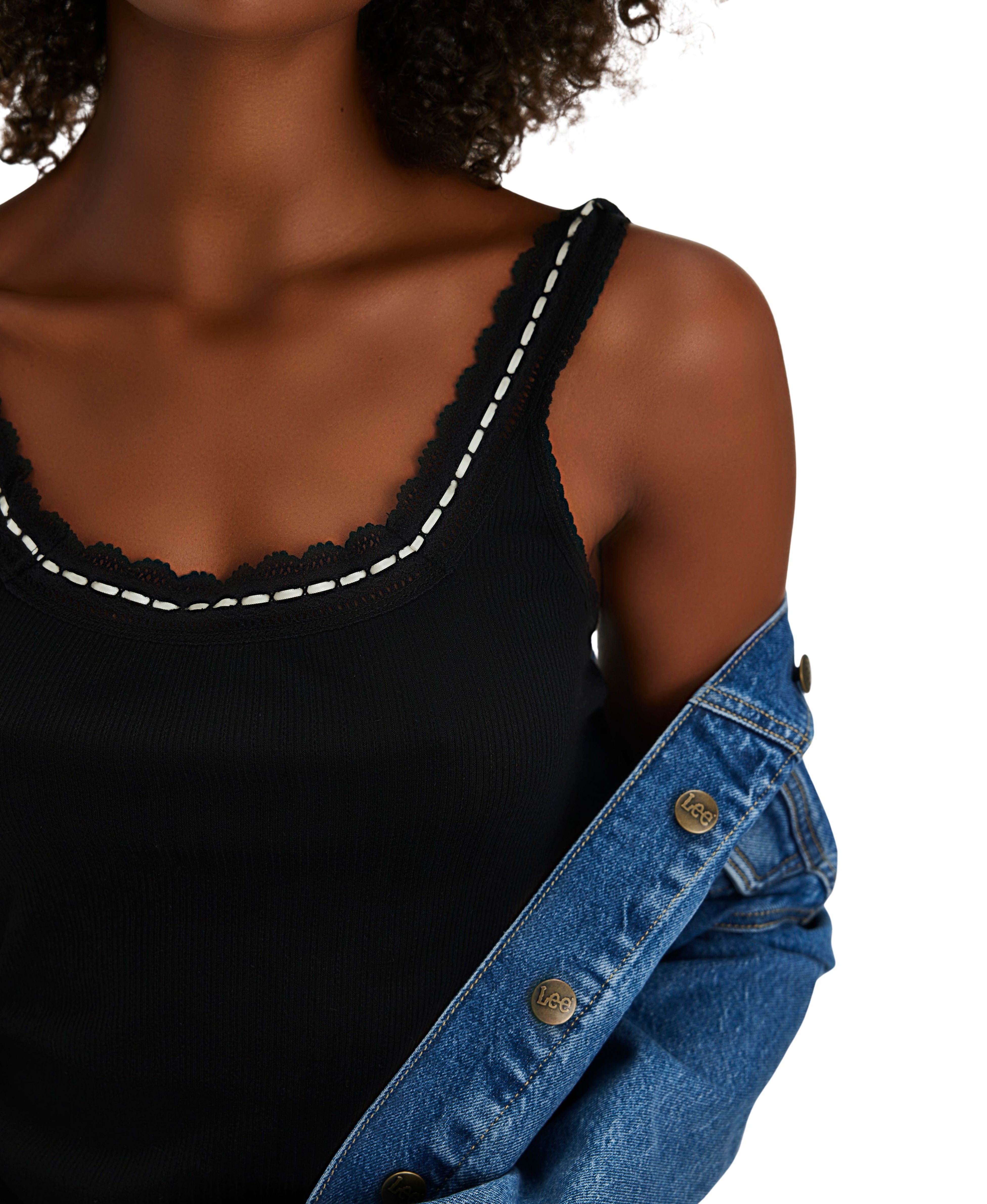 So simple with sweet details, this classic tank is featured in a sheer ribbed cotton knit with ribbon-adorned lace trim.