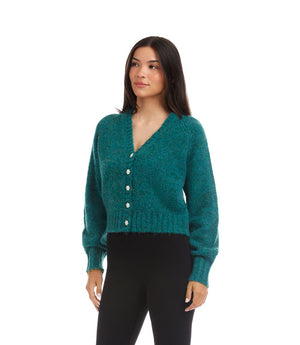 Cozy yet refined, this Pearl Button Cardigan Sweater is crafted from a minimal wool-blend knit that offers warmth with a soft, lightweight feel. Designed with a ribbed V-neckline and raglan sleeves for a relaxed silhouette, it features ribbed hem and cuffs and delicate pearl-inspired buttons that add a feminine, elevated touch.