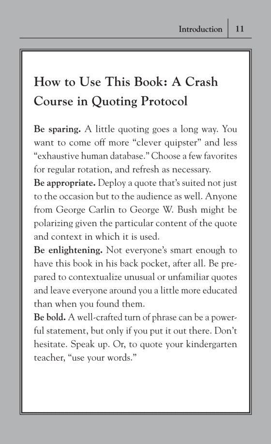 Perfect for the guy who knows everything and wants the words to match! This little book offers in-depth investigations into “who said what,” counterquotes for common clichés, and tips for citing sayings without sounding stupid. Never be at a loss for words again! Includes quotes from: