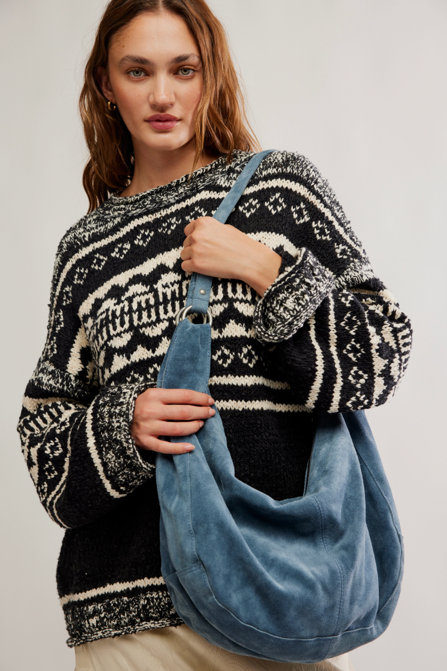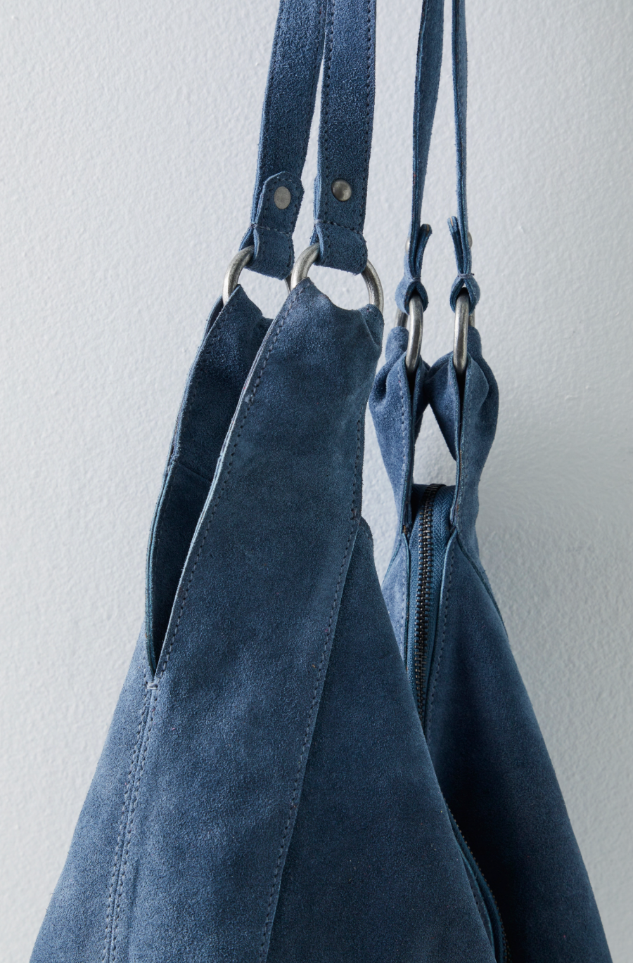 Effortlessly functional, this tote bag is featured in a slouchy hobo style with two elongated shoulder straps, all in soft suede fabrication with zipper closure for the perfect go-to bag.