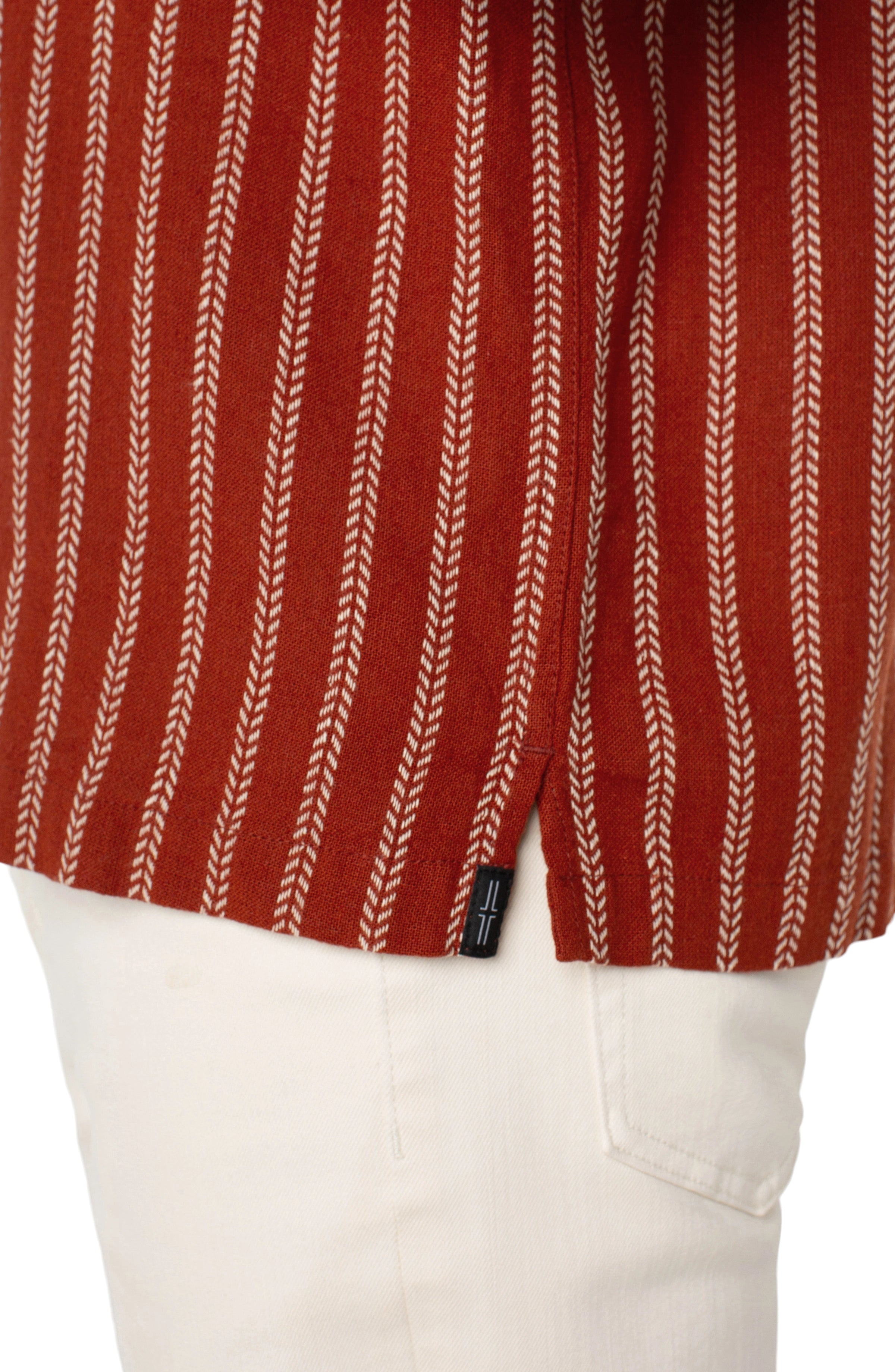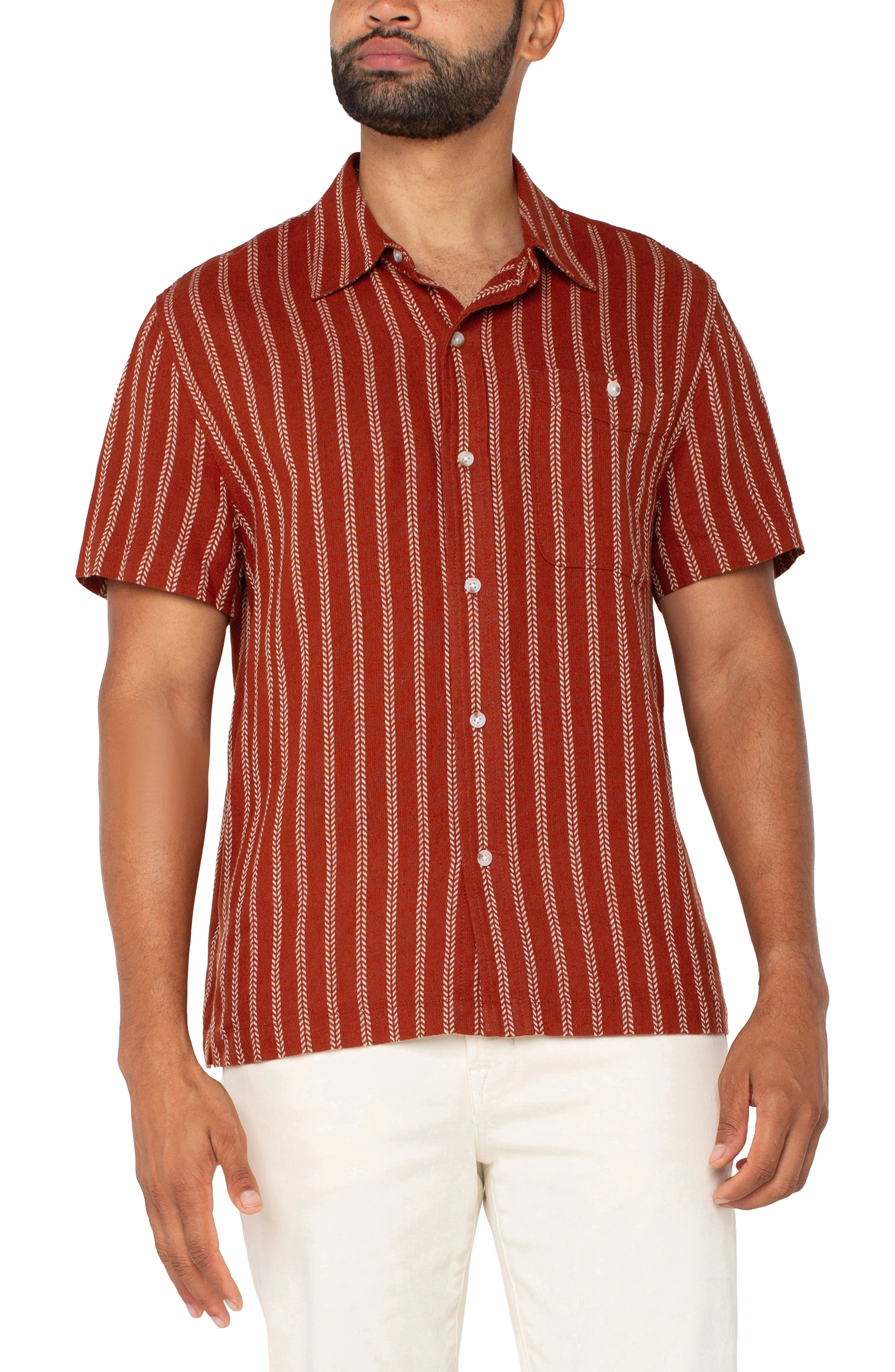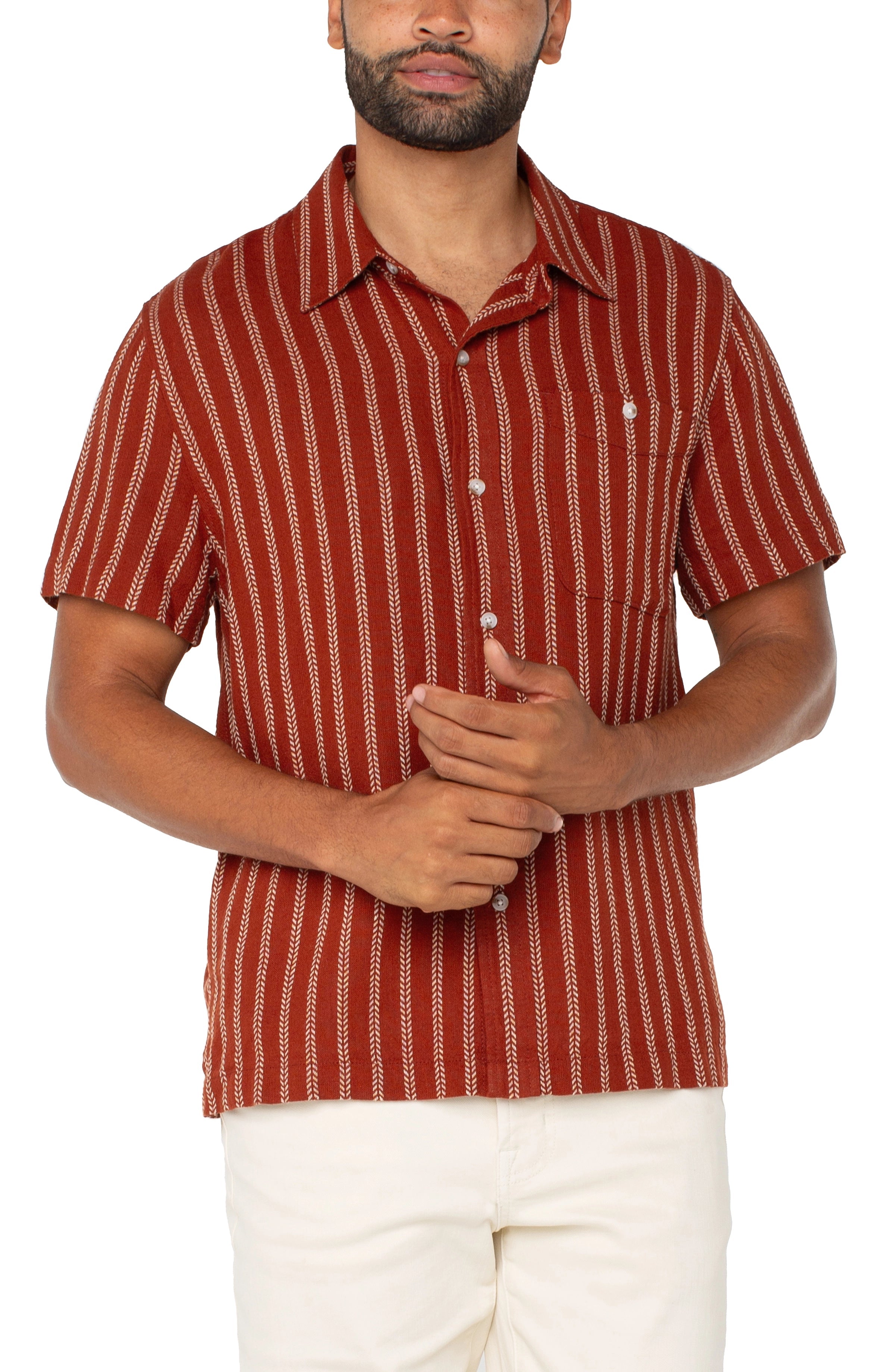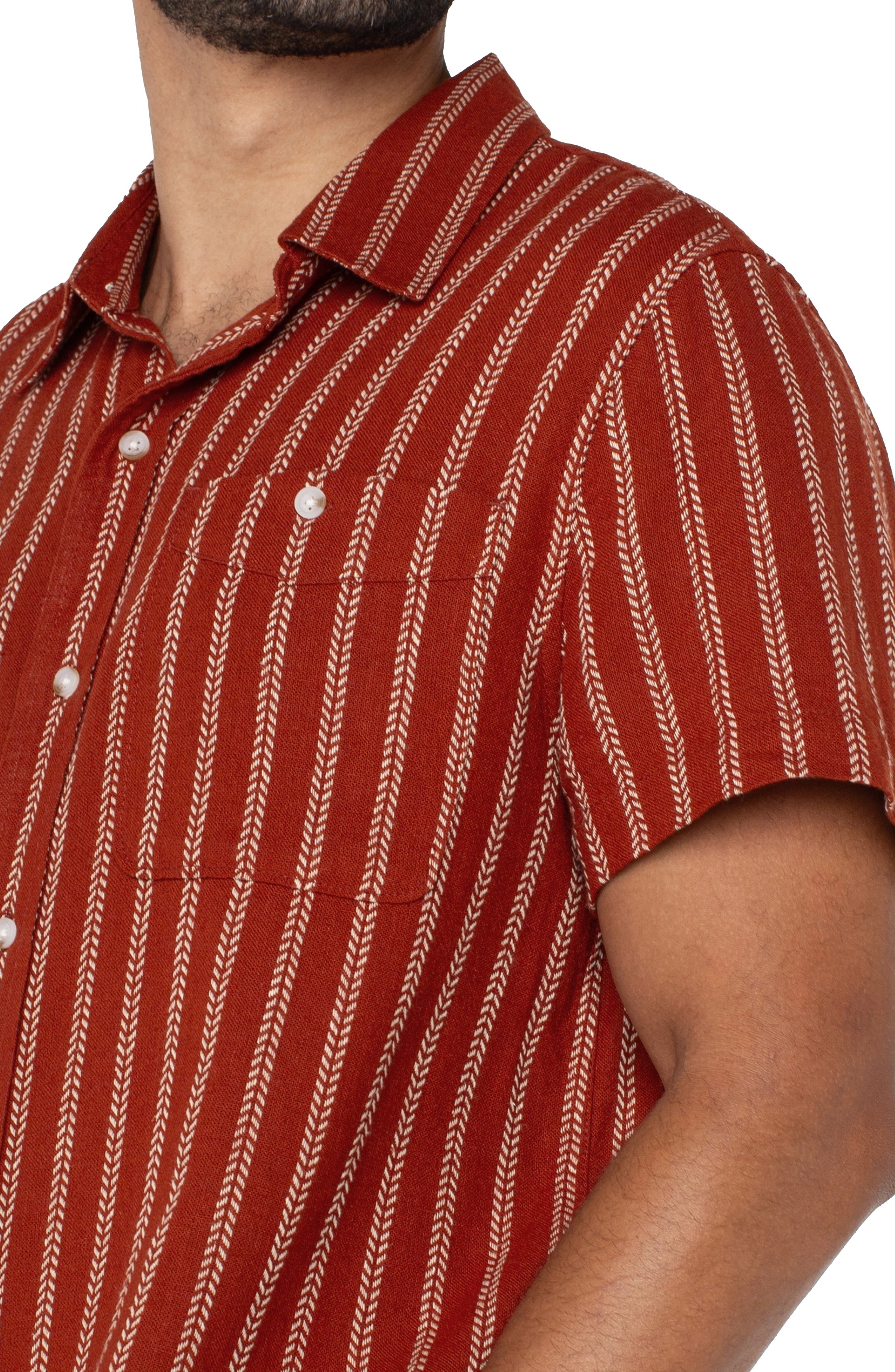 This short sleeve button-up features a bold striped pattern and an easy, broken-in feel. Wear it open over a tee or buttoned up with denim for a look that hits laid-back and pulled together all at once. Finished with a chest pocket and clean tailoring throughout.