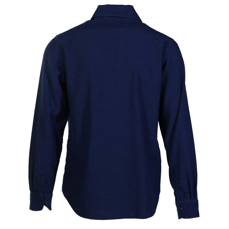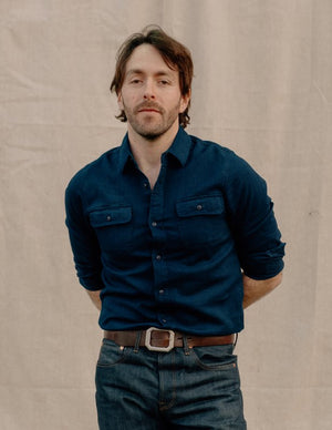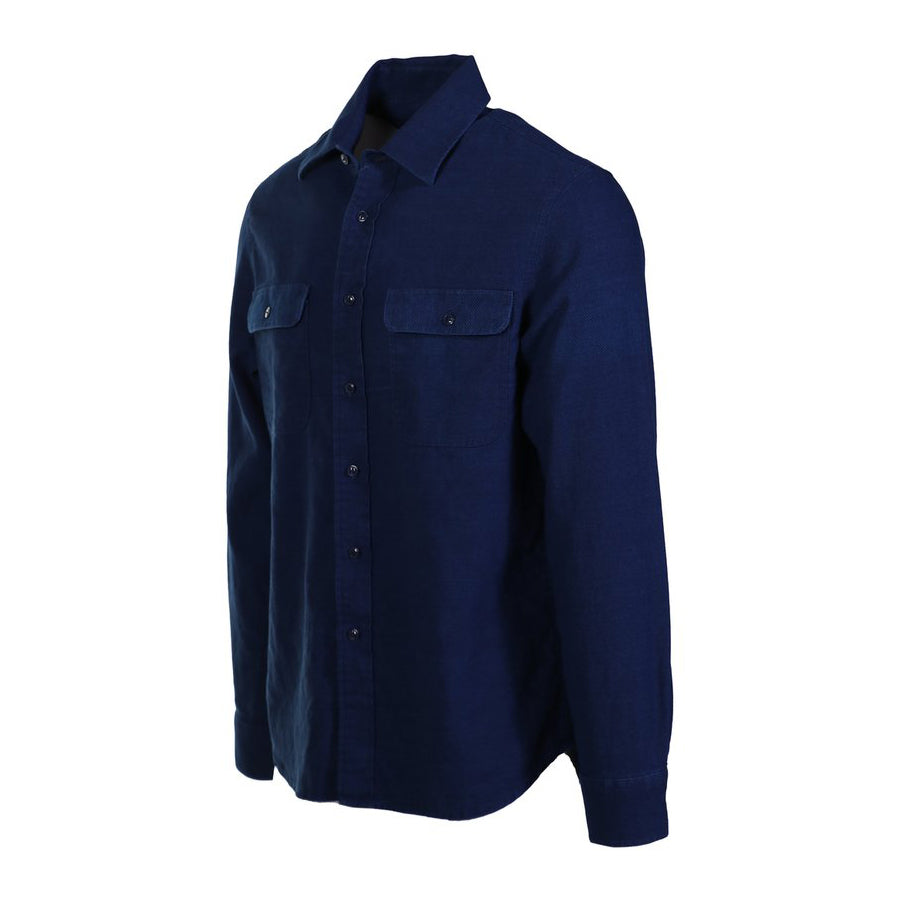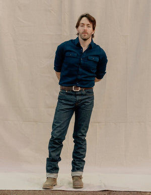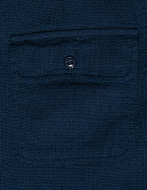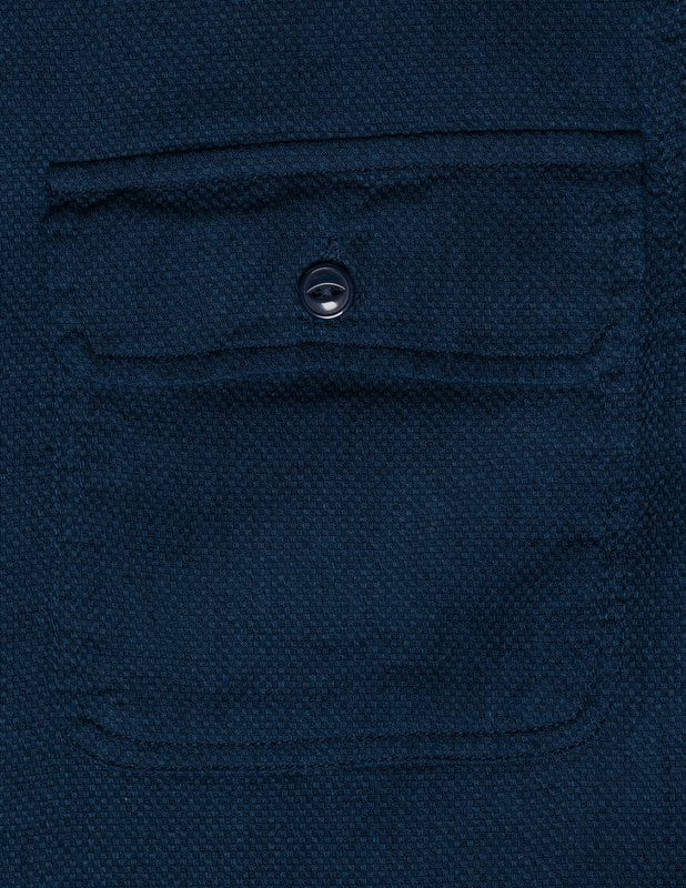 Both the warp and weft are made of indigo dyed yarns which are loomed in a basket weave to create this double indigo shirt with cat's eye buttons