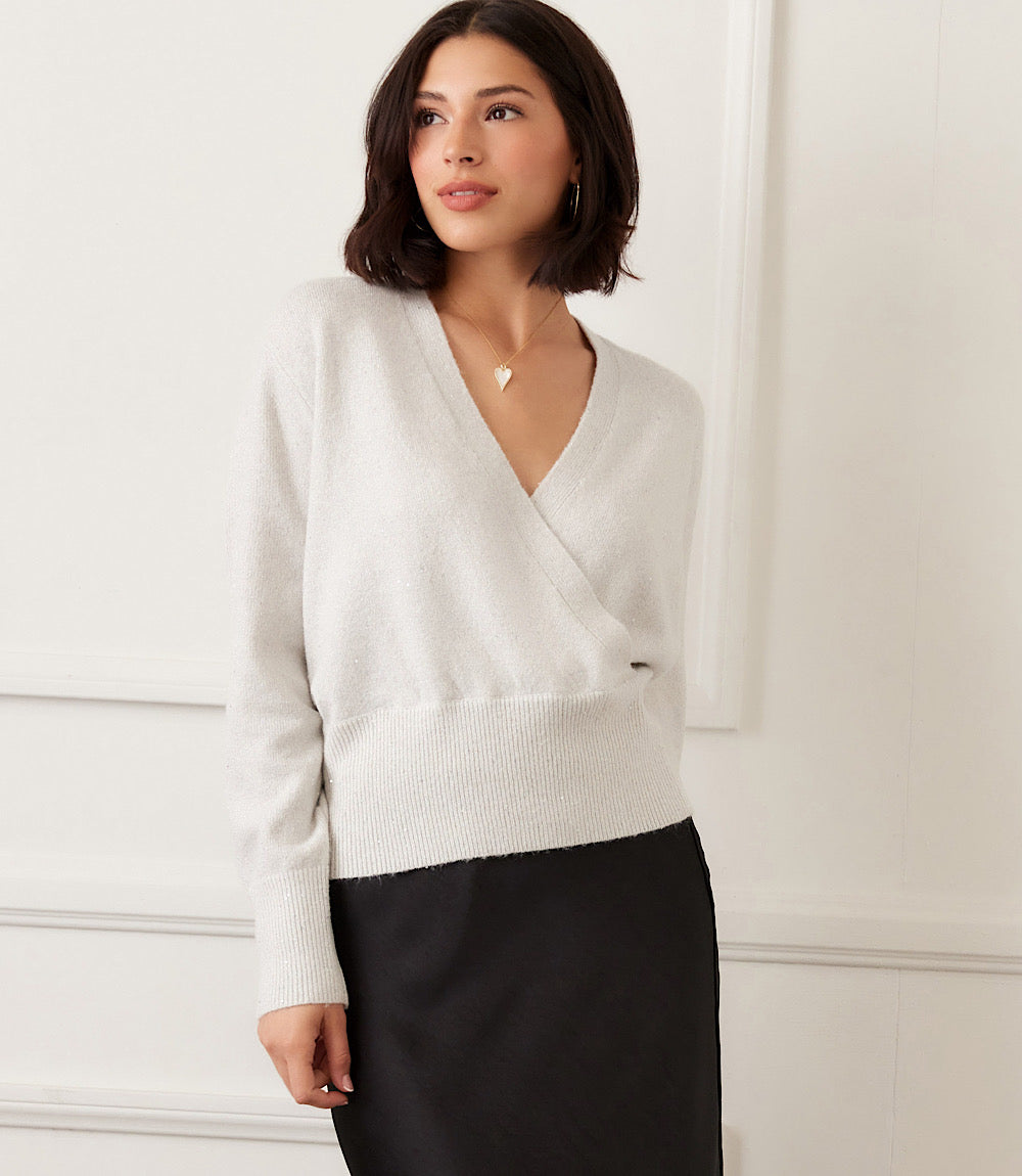 Elevate your knitwear with this effortlessly chic wrap-style sweater. Designed with a crossed V-neckline and slightly dropped shoulders, it creates a flattering silhouette that feels both modern and timeless. The subtle sequin detailing woven into the fabric adds a touch of shimmer, making it perfect for day-to-night wear. Finished with long sleeves and a wide ribbed band at the waist, this pull-on style offers a comfortable yet polished fit.