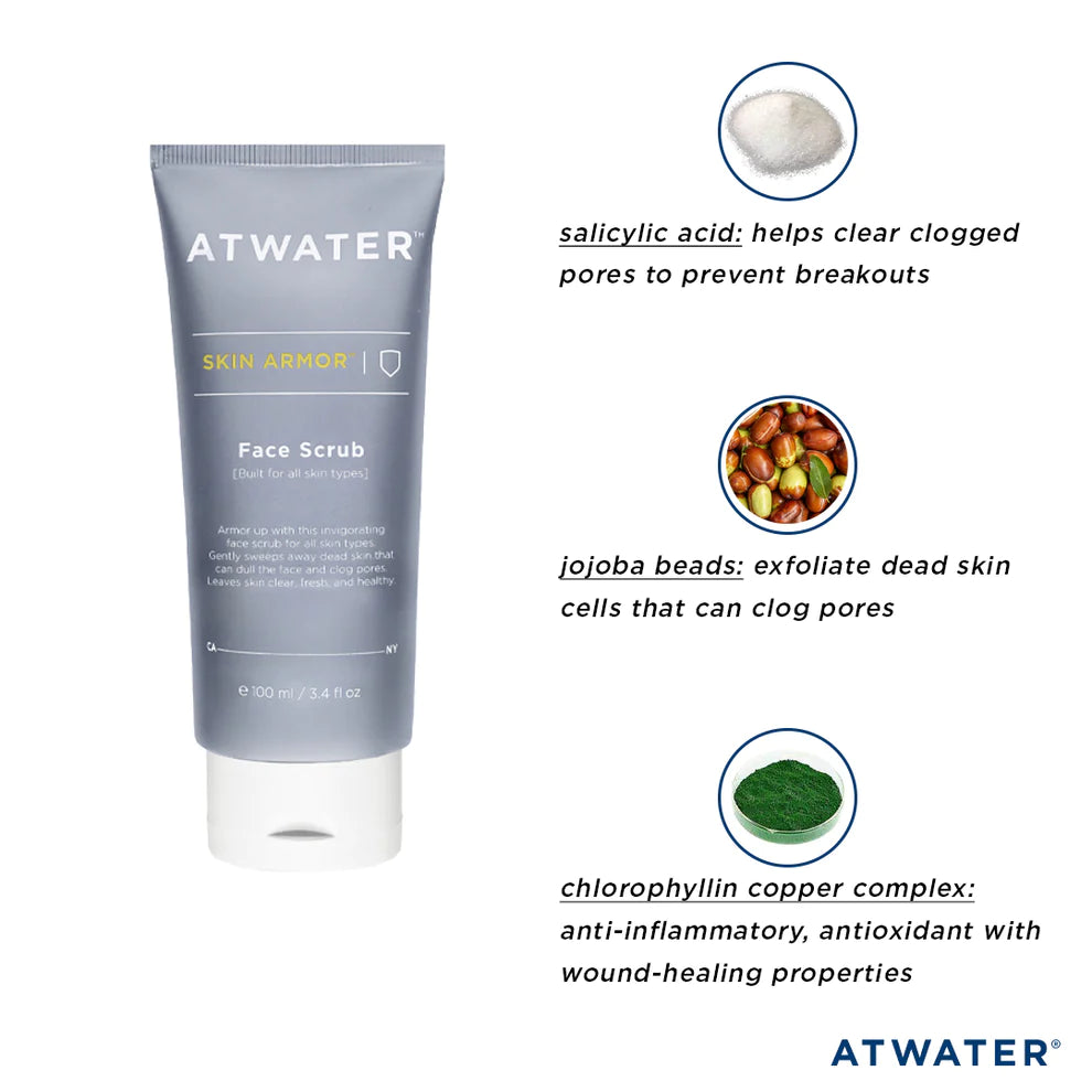 What it does: Armor up with this invigorating face scrub for all skin types. Salicylic acid exfoliating scrub gently sweeps away dead skin that can dull the face and clog pores. Jojoba seed oil is an emollient plant oil with properties similar to oils found in human skin; a rich source of skin-soothing fatty acids. Salicylic acid is an efficient, oil-soluble beta hydroxy acid (BHA) with exfoliating and anti-acne properties that helps to clear clogged pores that can lead to acne breakouts and blackheads. Chlorophyllin copper complex is a semi-synthetic, naturally derived compound from chlorophyll that has anti-inflammatory, antioxidant and wound-healing properties. Leaves skin clear, fresh and healthy.
