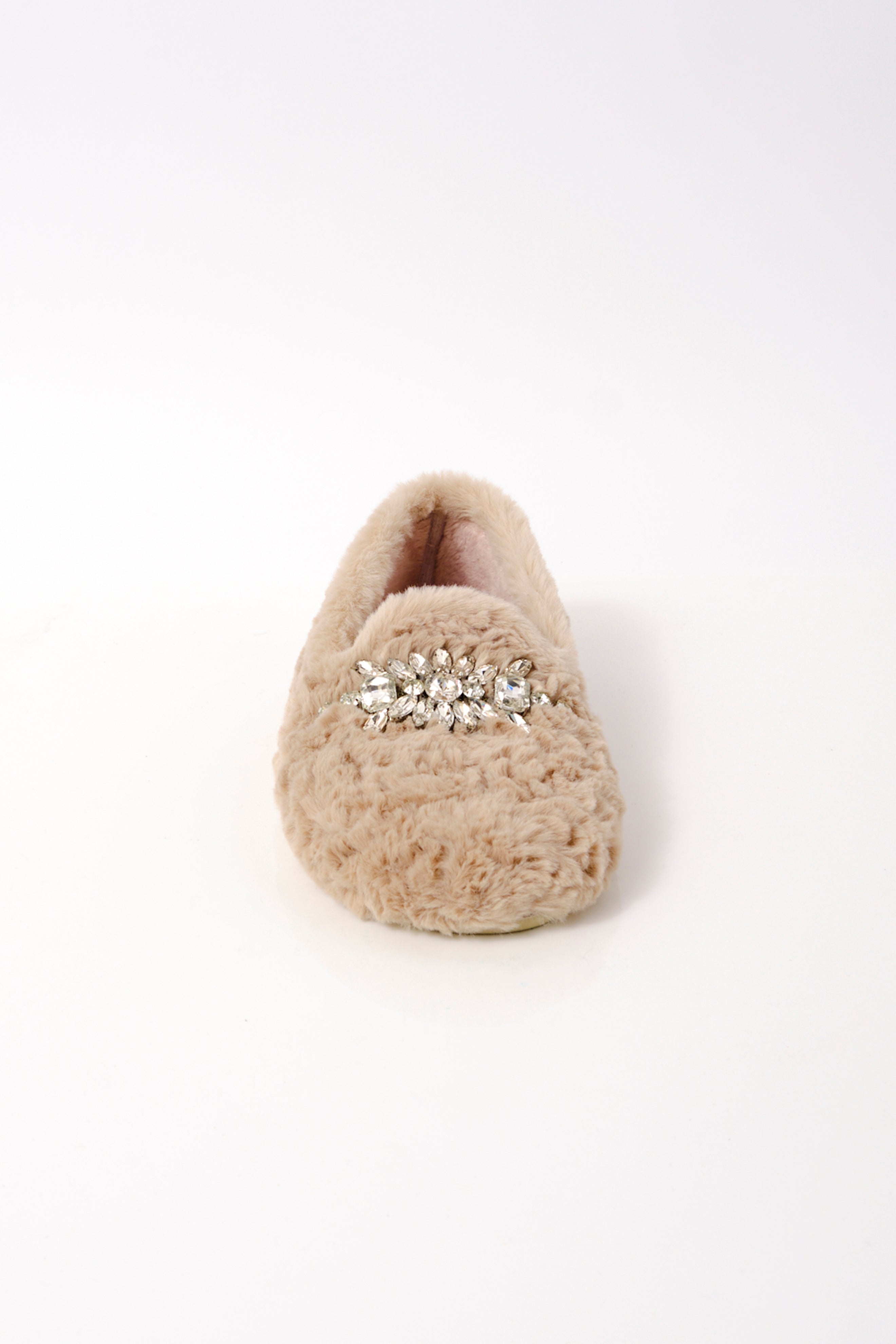 Features: Slip-on style, loafer design, faux fur uppers, round toe, removable and washable insock, rubber outsole, rhinestone details