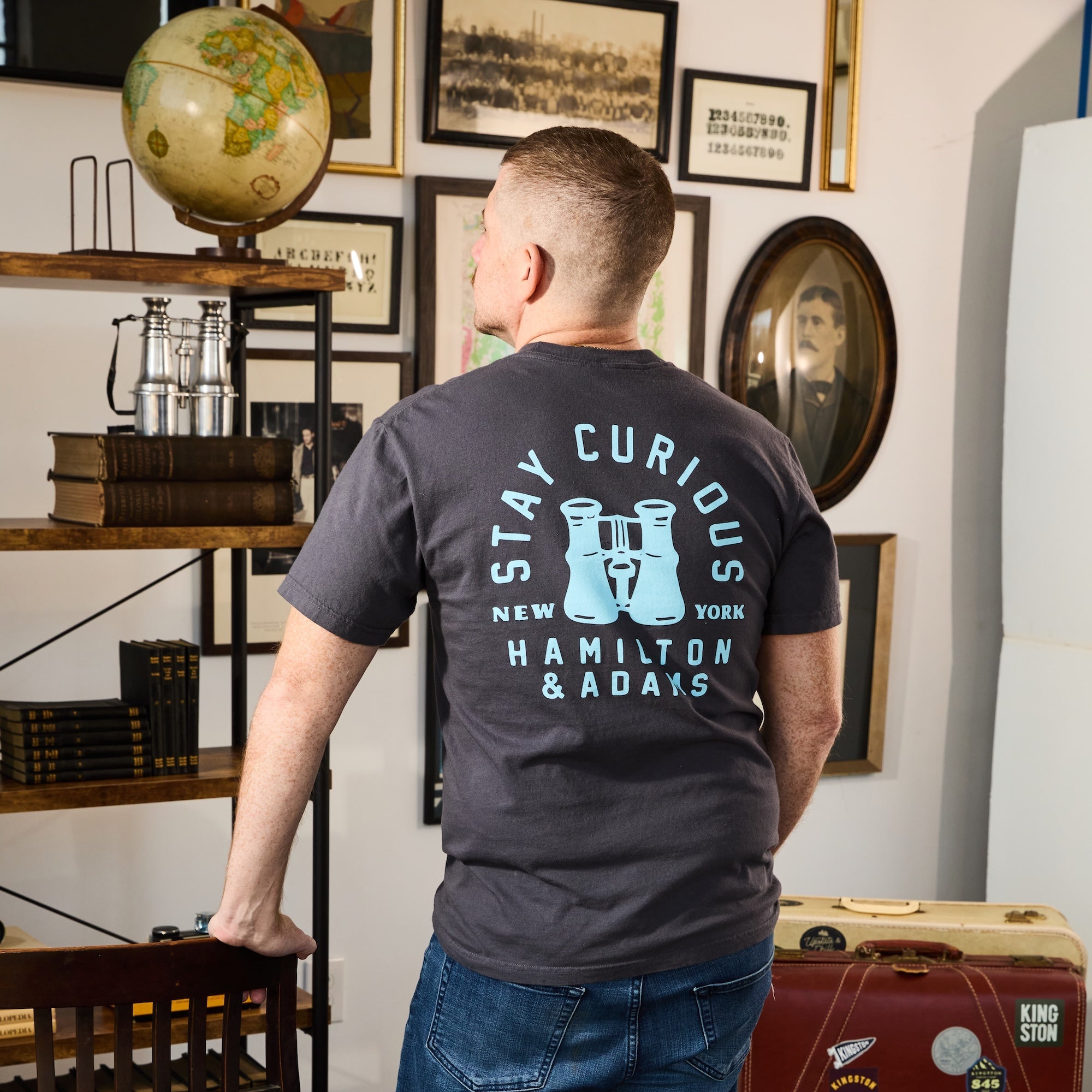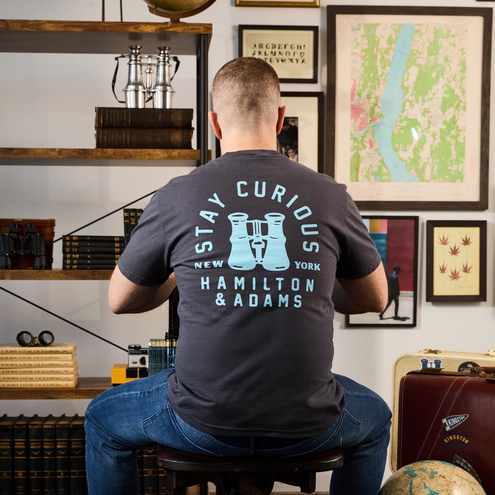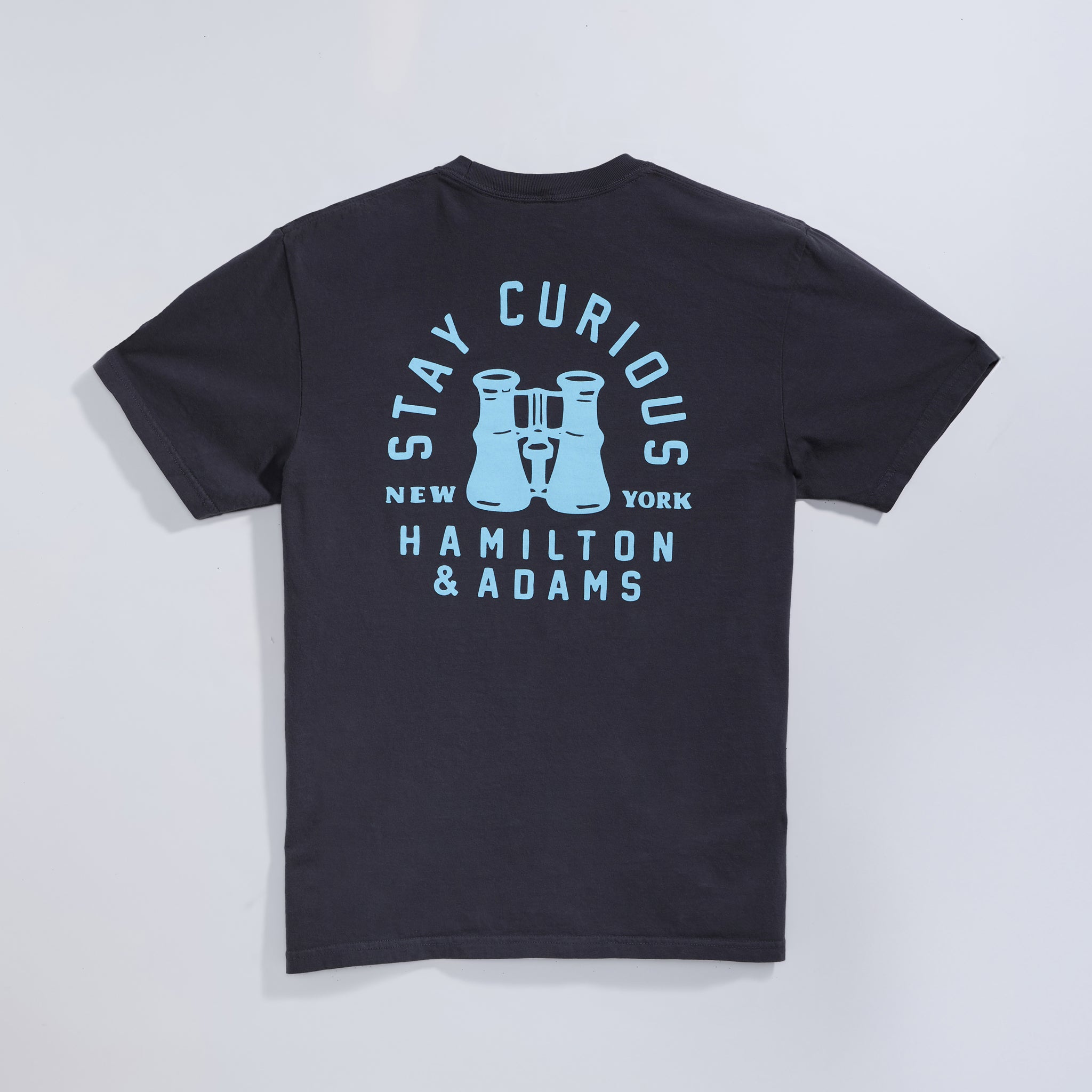 Curiosity leads the way. The Stay Curious Tee features a bold binocular graphic on the back and a clean front chest hit — a reminder to always keep looking, learning, and exploring.