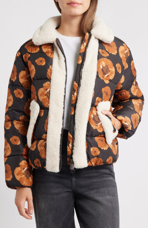When the flakes fly the flowers still bloom when you choose a blossom-tossed puffer trimmed in cozy high pile fleece. Front zip closure Spread collar Front flap pockets Lined, with recycled polyester fill.