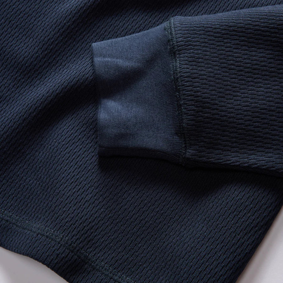 Durable organic cotton is loomed to a hardy 10-oz and finished in a vintage-inspired waffle texture for better insulation and a soft, textured hand. We’ve rounded out the package with ribbed accents at the collar and cuffs for a tidy fit.