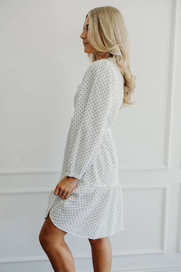Knee-length dress with a tiered skirt, smocked bodice, v-neckline, and long sleeves with elastic cuffs.