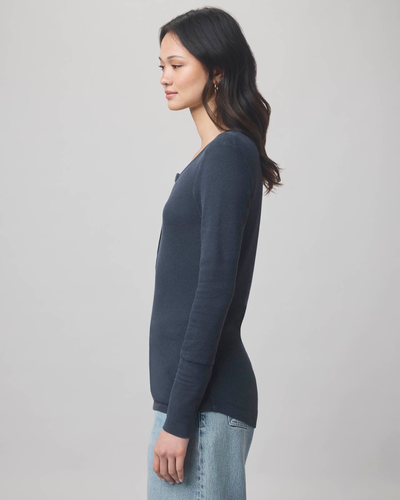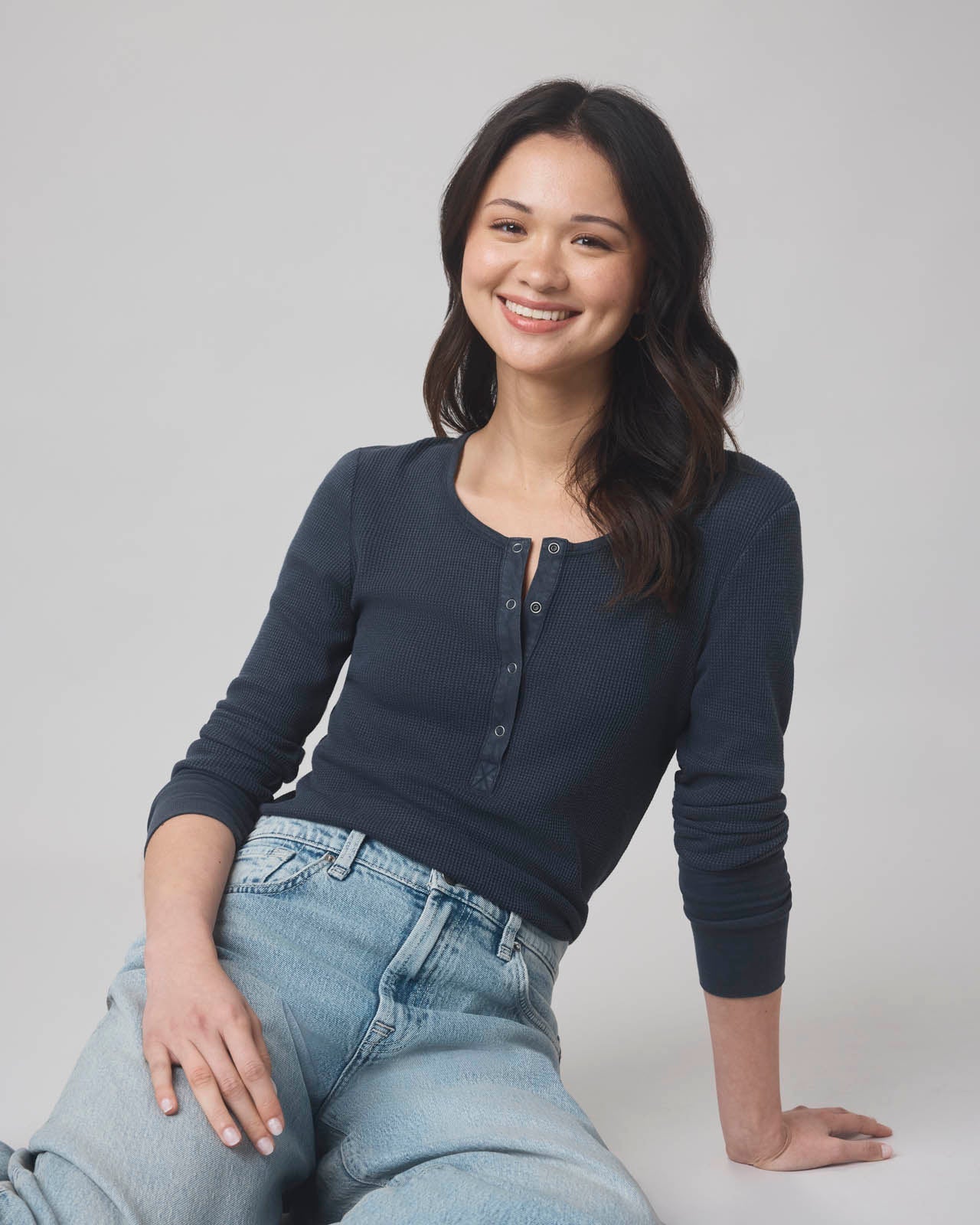 With its Henley button placket and elongated sleeve cuffs, this modern take on a timeless classic has an effortless slim fit crafted from a soft, thermal fabric with hugs-you-in-the-right-places stretch. Our Thermal Forever Henley is the women's long sleeve henley your closet needs!