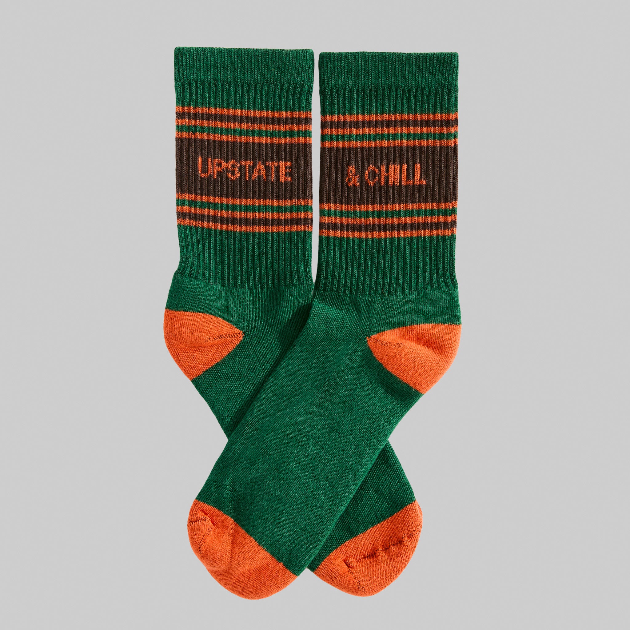 Made from American-grown combed cotton, these crew-length socks are knit from some of the finest cotton in the world – and they are ready to stand the test of time. Boasting a vintage yet timeless style, these Upstate & Chill socks make ideal companions for boots, sneakers, or lazy weekend mornings by the fire.